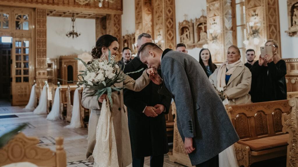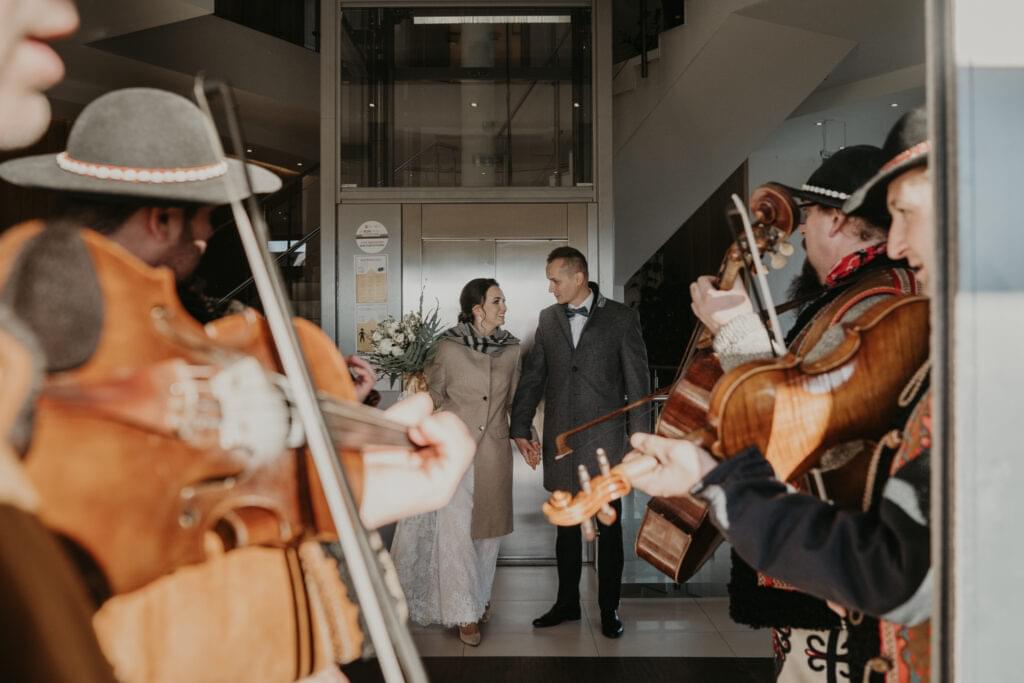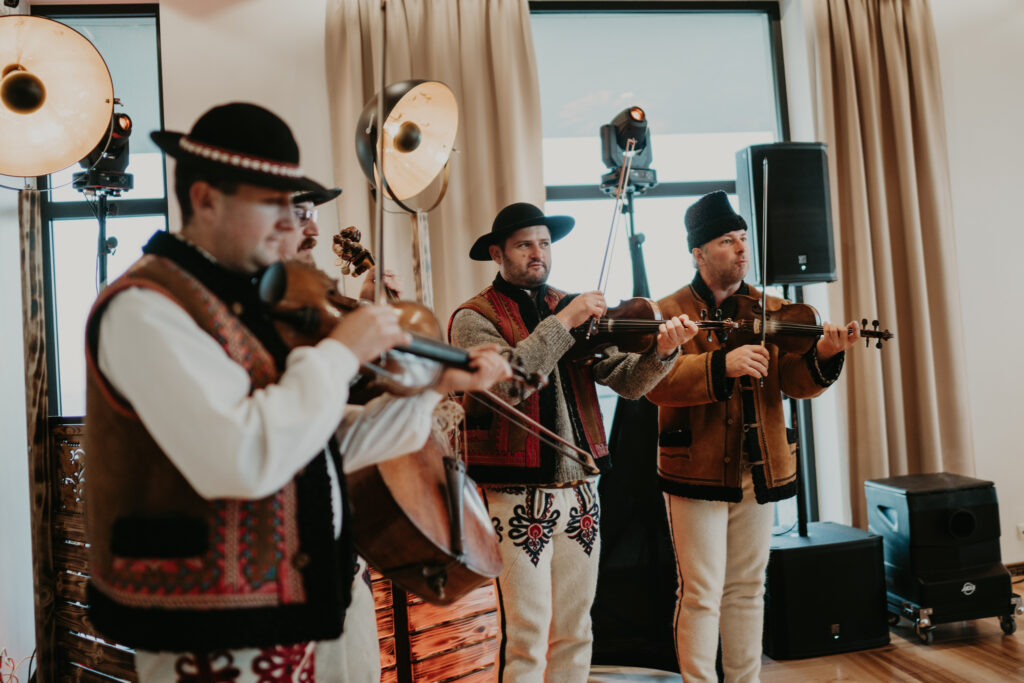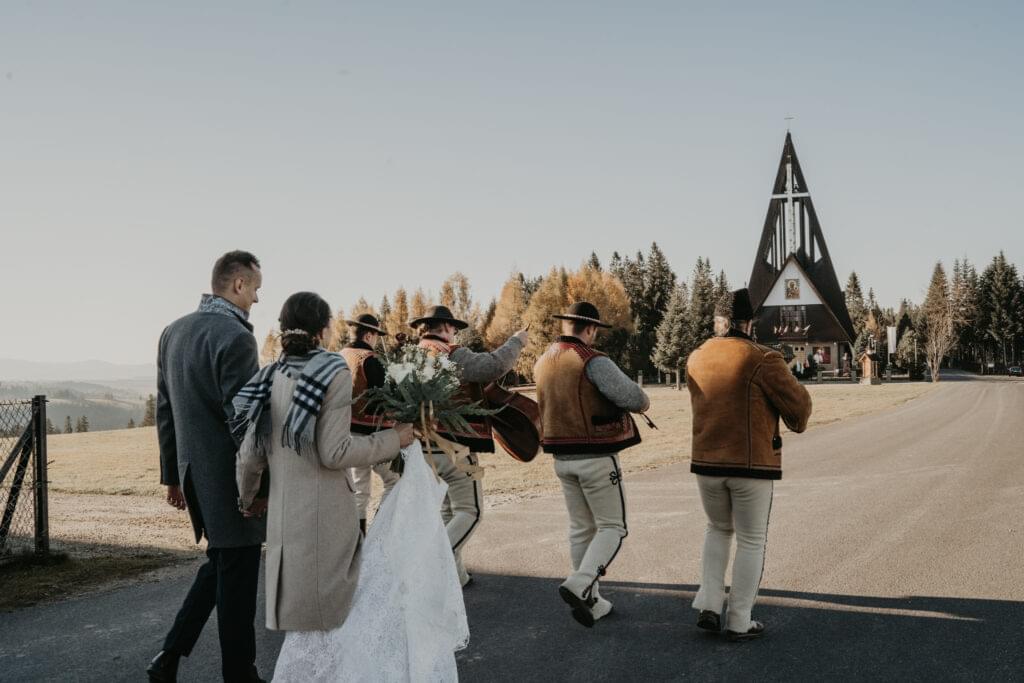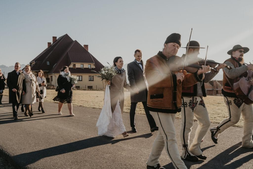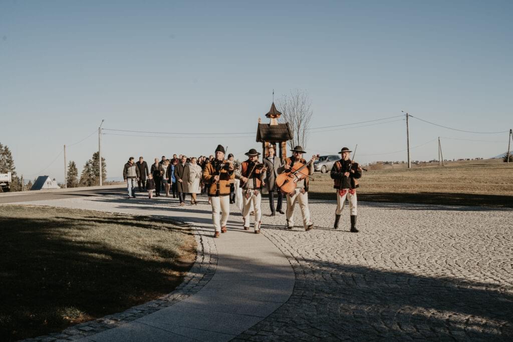 W drodze do kościoła, młodej parze towarzyszyła tradycyjna muzyka regionalna, dodając uroku i podkreślając ich silne związanie z kulturą i tradycjami regionu. Dźwięki skrzypiec i kontrabasu wprowadziły wszystkich w magiczną atmosferę tej uroczystości, a przepiękne melodie pozostały w pamięci gości na długo po zakończeniu wesela. To był niezapomniany moment, kiedy to wśród górskich krajobrazów i tradycyjnej muzyki Oliwia i Janek rozpoczynali swoją drogę małżeńską.