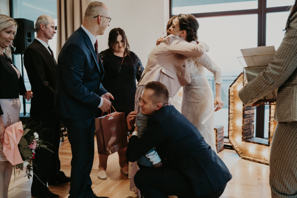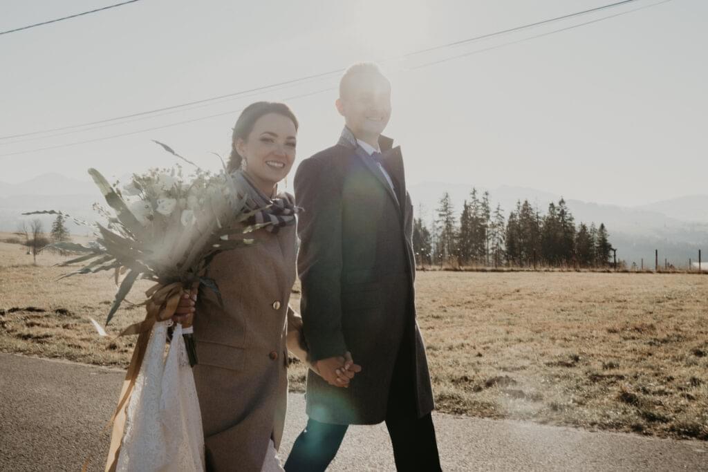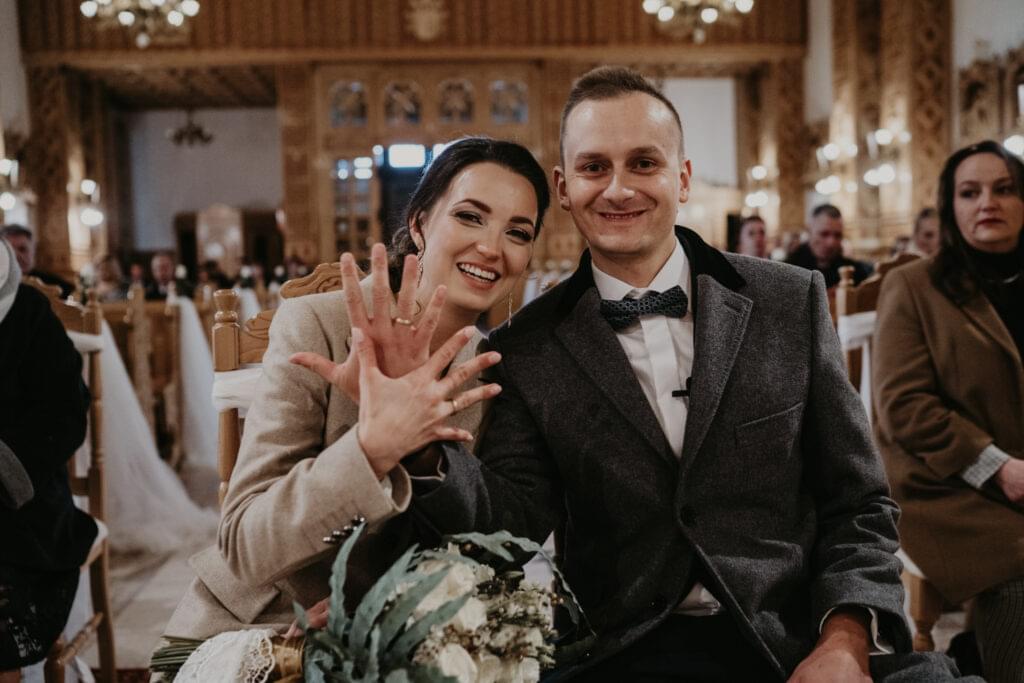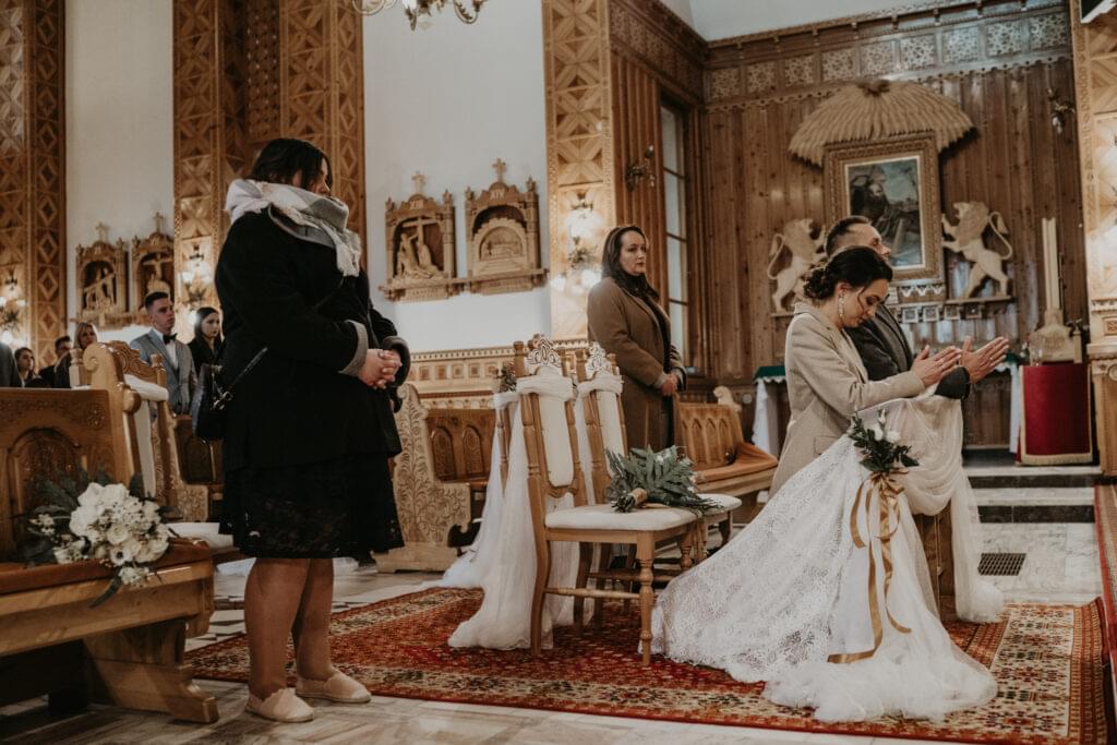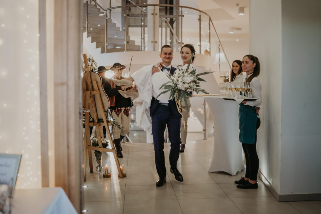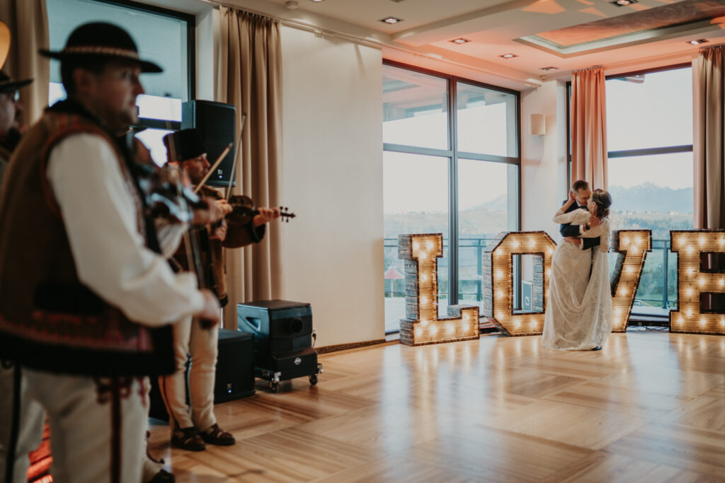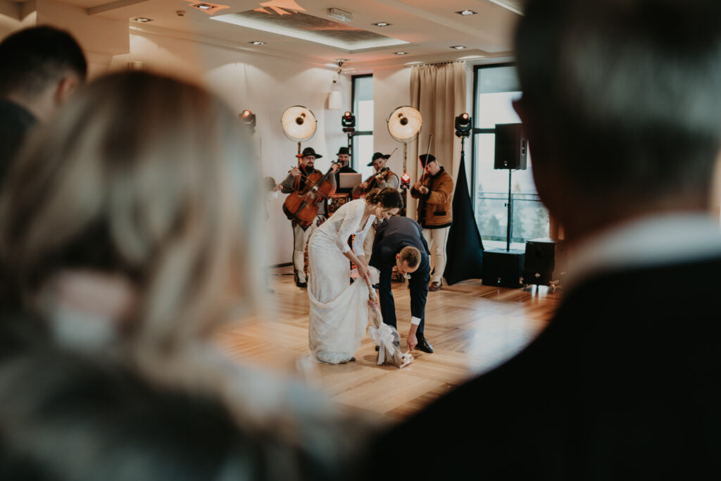 W drodze do kościoła, młodej parze towarzyszyła tradycyjna muzyka regionalna, dodając uroku i podkreślając ich silne związanie z kulturą i tradycjami regionu. Dźwięki skrzypiec i kontrabasu wprowadziły wszystkich w magiczną atmosferę tej uroczystości, a przepiękne melodie pozostały w pamięci gości na długo po zakończeniu wesela. To był niezapomniany moment, kiedy to wśród górskich krajobrazów i tradycyjnej muzyki Oliwia i Janek rozpoczynali swoją drogę małżeńską.