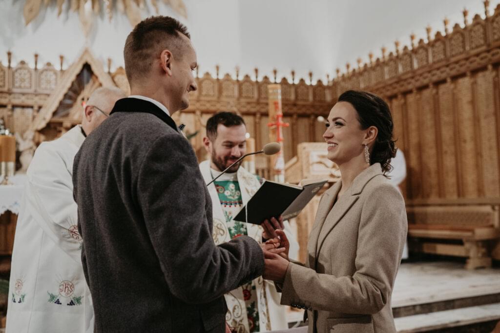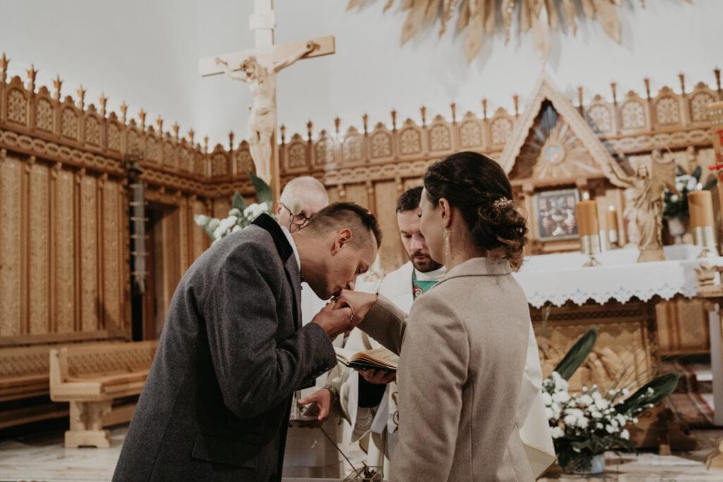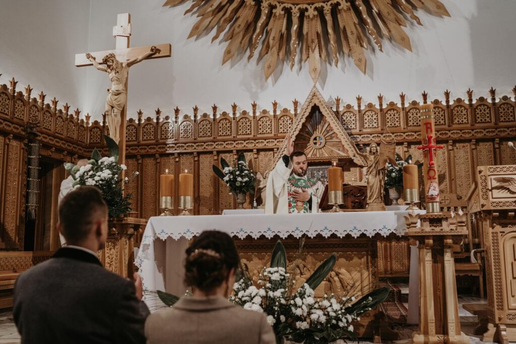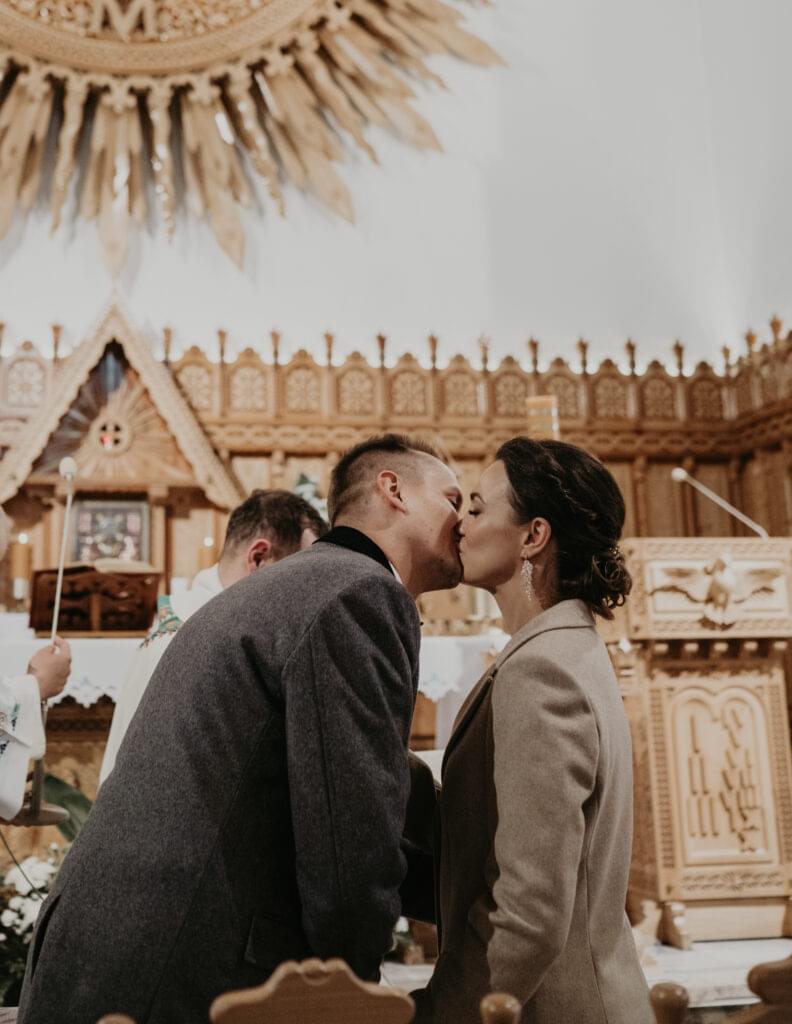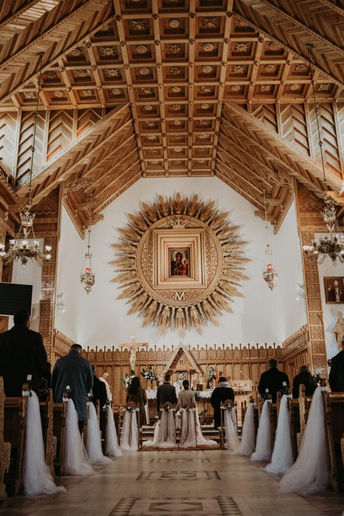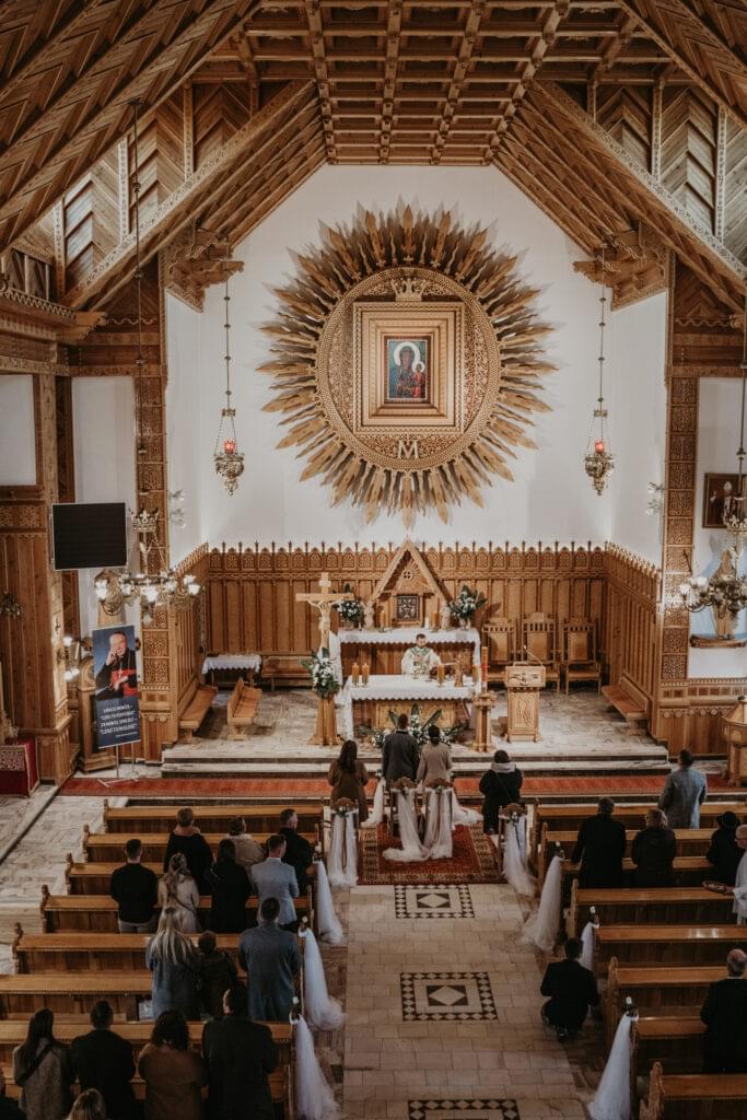 Kościół, w którym odbył się ślub, zachwycił nas swoim góralskim stylem - jasne drewno, rzeźbione elementy na sklepieniu sprawiały, że czuliśmy się jakbyśmy weszli do prawdziwej góralskiej kaplicy.