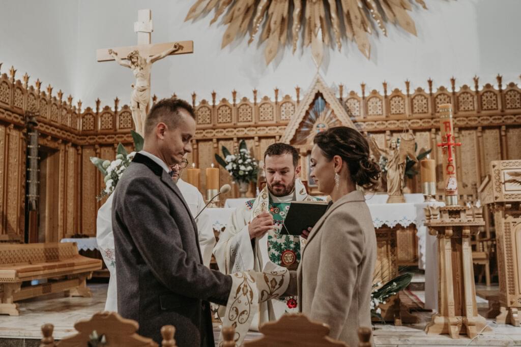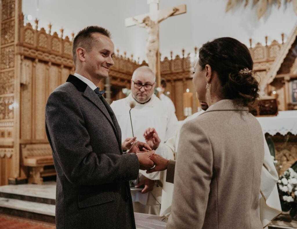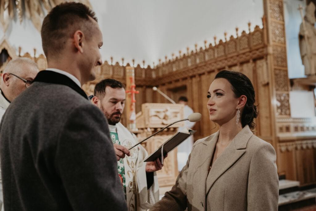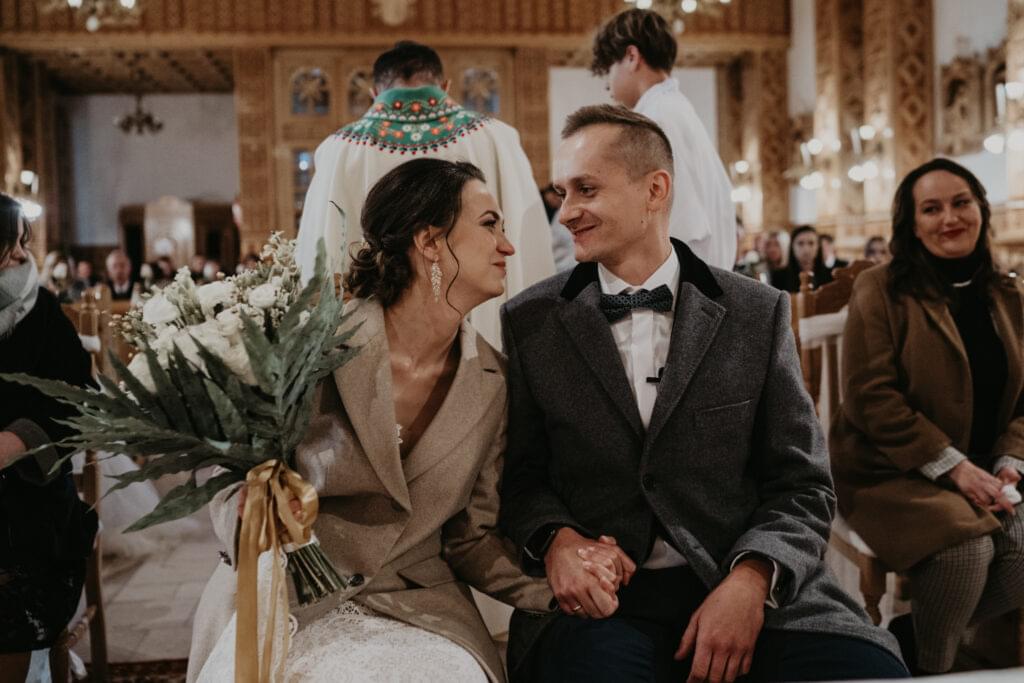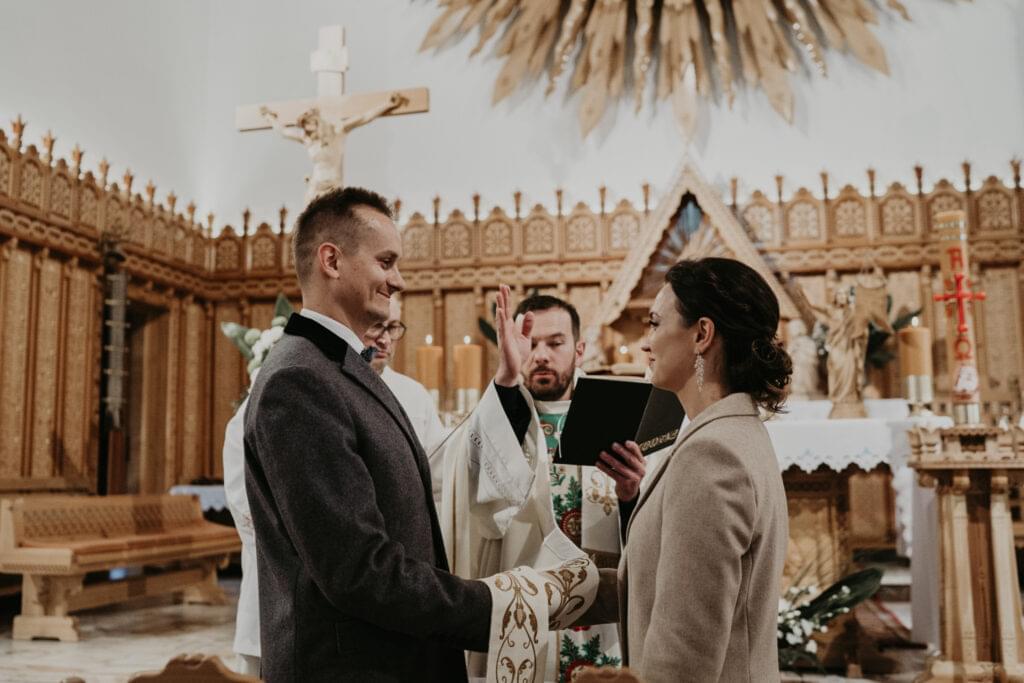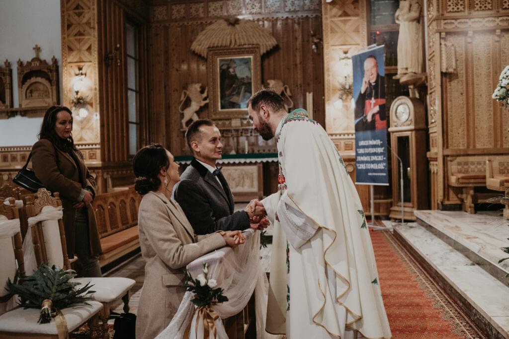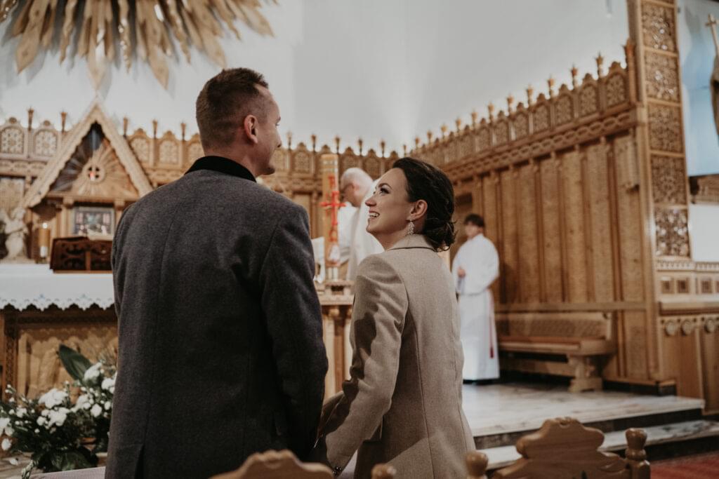 Kościół, w którym odbył się ślub, zachwycił nas swoim góralskim stylem - jasne drewno, rzeźbione elementy na sklepieniu sprawiały, że czuliśmy się jakbyśmy weszli do prawdziwej góralskiej kaplicy.